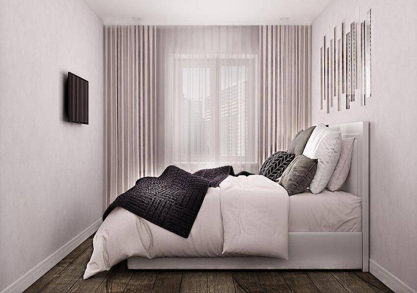 Каждый по отдельности неплох, но их явный перебор, они конкурируют за внимание. Мы ведь уже знаем, что спальня в современном стиле должна быть простой. Попробуем сделать эту чуть проще