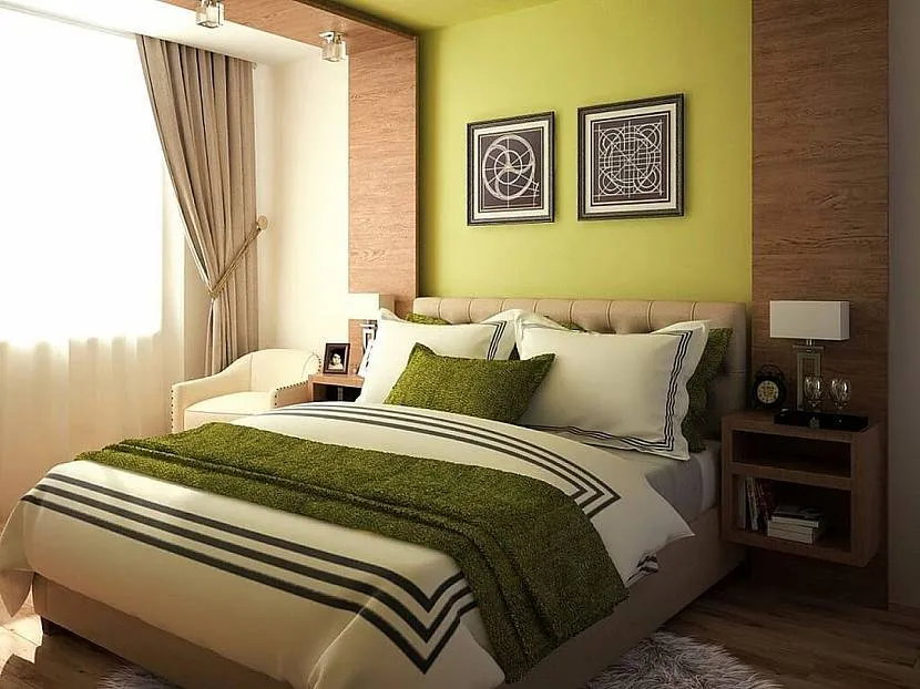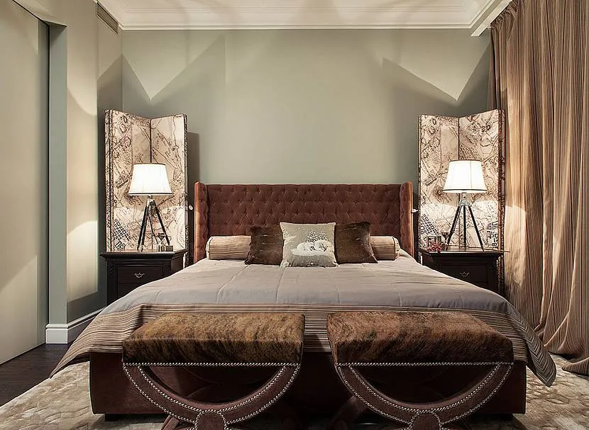 Заслуживает упоминания также спальня коричнево-бежевая. Более изысканного и элегантного интерьера не придумать. Комбинация из бежевого, тёмно-шоколадного и зелёного тонов обеспечивает идеальную обстановку для борьбы со стрессом. А бежевый, песочный и ярко-коричневый оттенки являются оптимальным выбором для особ, страдающих нарушением сна.