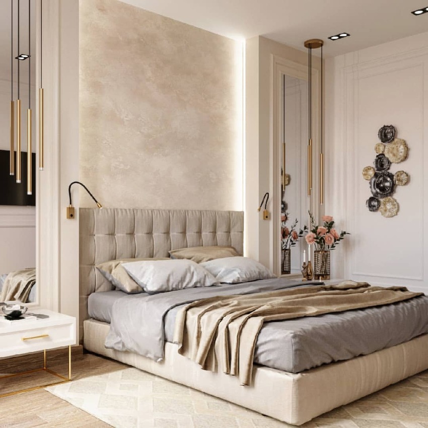 Хм, а эта спальня с современном стиле или в классическом? Нижняя часть фото, кроме светильников, явно говорит о современном стиле. А вот потолок, включая потолочный плинтус с лепниной и люстру, явно пришёл из стиля классического. Тут мы вспоминаем ещё одно правило сочетания стилей: