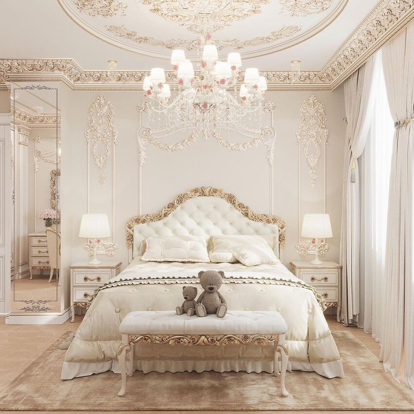 Классическим вариантом для такой спальни является светлый натяжной потолок. Кто-то отдает предпочтение оштукатуренному потолку. На нем изящно может смотреться аккуратная лепнина. Но такой потолок нуждается в регулярном обновлении, так как на нем могут возникать трещины, осыпание штукатурки. Потолок темного цвета следует делать только в том случае, если вы уверены, что он идеально впишется в общий дизайн помещения.