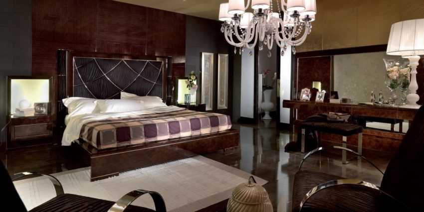 При этом темный цвет мебели может перемежаться с различными светлыми вставками, что сделает спальню более утонченной.