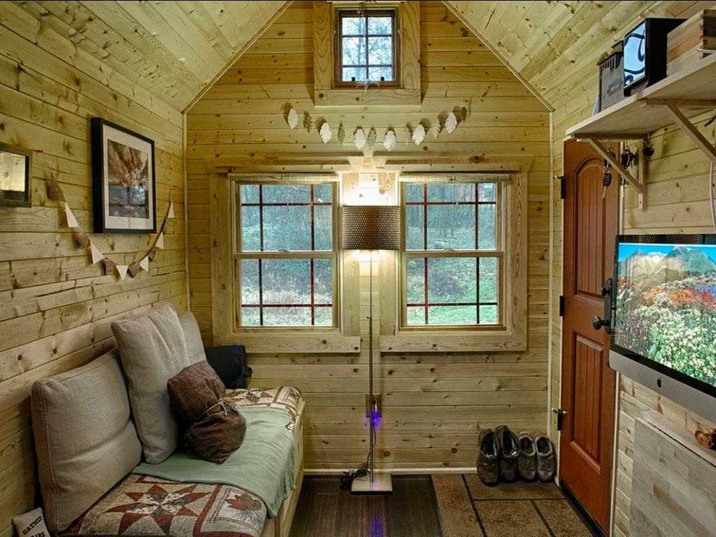 Спальню можно совместить с гостиной, где будет стоять раздвижное кресло и диван-книжка. Также спальня может быть на веранде, мансарде. Для детей подойдет двухъярусная кровать или кровать-чердак на шкафу.