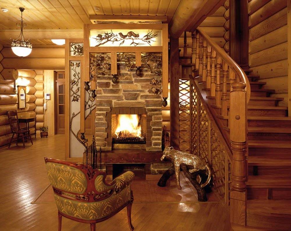 Камин в охотничьем домике должен быть обязательно и, желательно, настоящим. Рядом с камином размещают кованые аксессуары:
