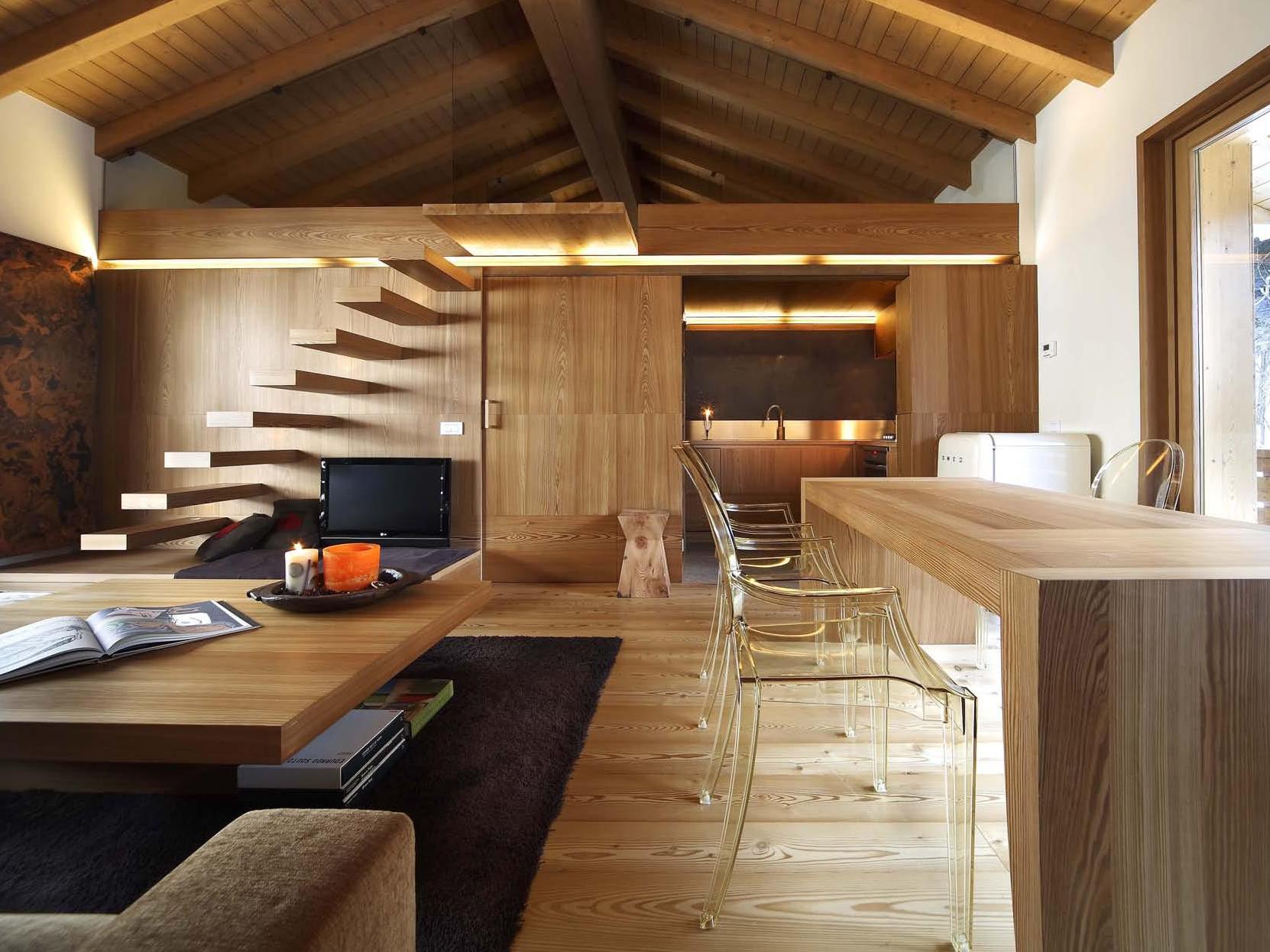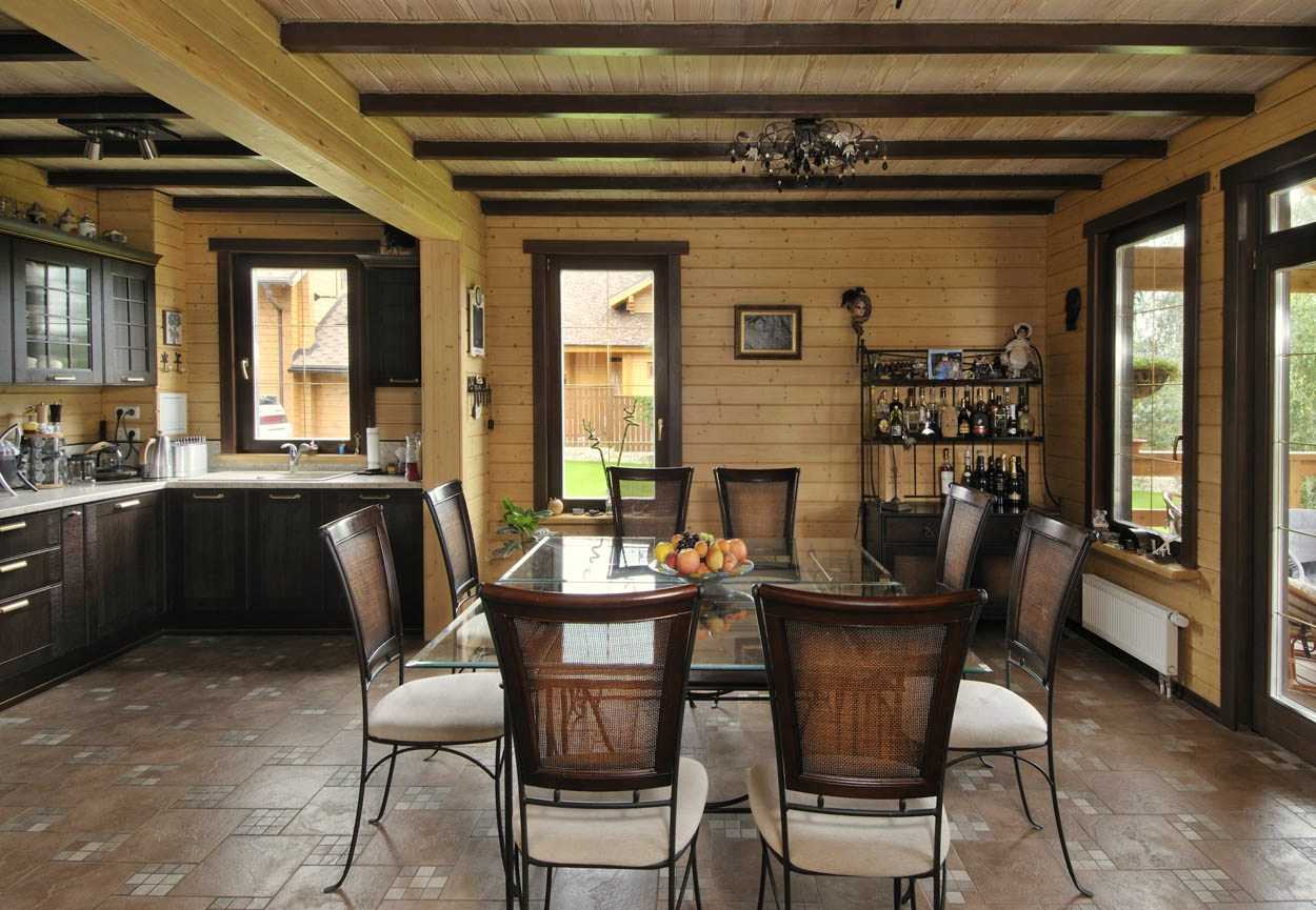 Основные материалы должны быть естественными. Так стены лучше оставить без отделки, а для пола использовать массивные доски. Балки под потолком перекрывать не следует.