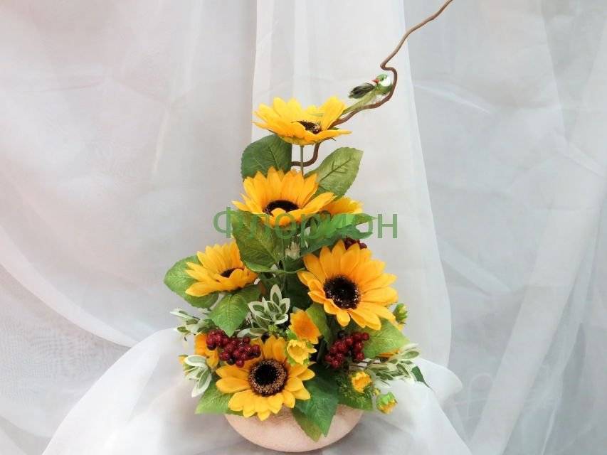 - искусственные растения дают возможность самостоятельно подбирать цветовой оттенок букета. Если вам по душе ярко-желтые подсолнухи, но весь интерьер оформлен в сдержанных тонах и классическом ключе, и вы не хотите, чтобы композиция на стене выбивалась из общей стилистики комнаты, выход есть. Необходимо всего лишь затонировать лепестки подсолнухов в подходящий оттенок.