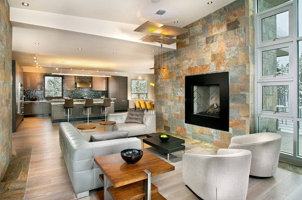Сложная дизайнерская проблема – это оформление границы зон кухни и гостиной в студии. Каменная линия станет прекрасным ее решением.