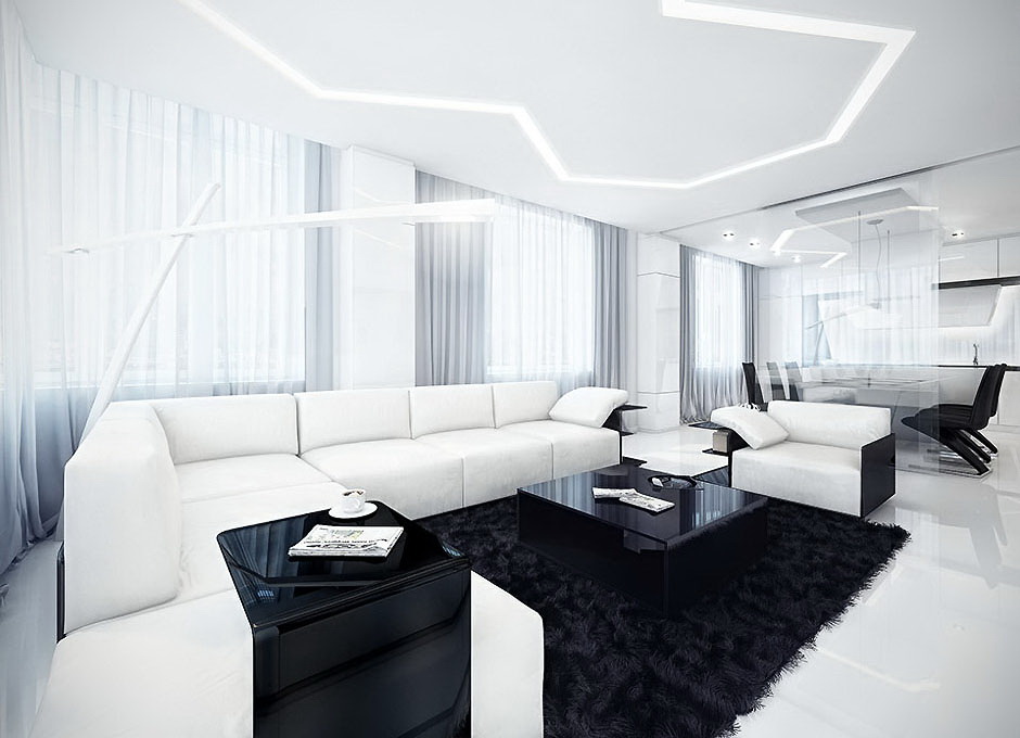 Белая гостиная комната значит, что и потолок будет в том же цвете. Белый потолок делает комнату выше, позволяет избавиться от давления, исходящего от стен в ограниченном пространстве, и скрыть все особенности строения. Как вариант, можно сделать натяжные потолки.