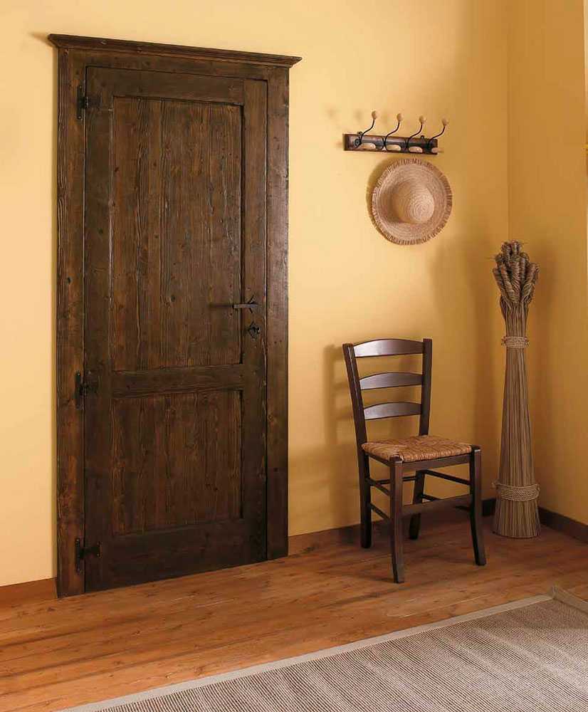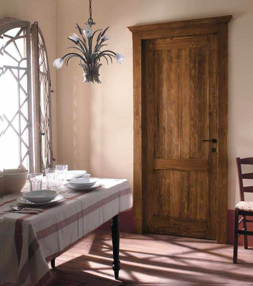 Отличительными особенностями данного вида дверей являются их надежность, прочность и, как следствие, более длительный срок эксплуатации. Чтобы дверь была прочной, но облегченной, каркас чаще всего делают из сосны, а для большей сохранности иногда покрывают эмалью, которую дополнительно можно декорировать патиной.