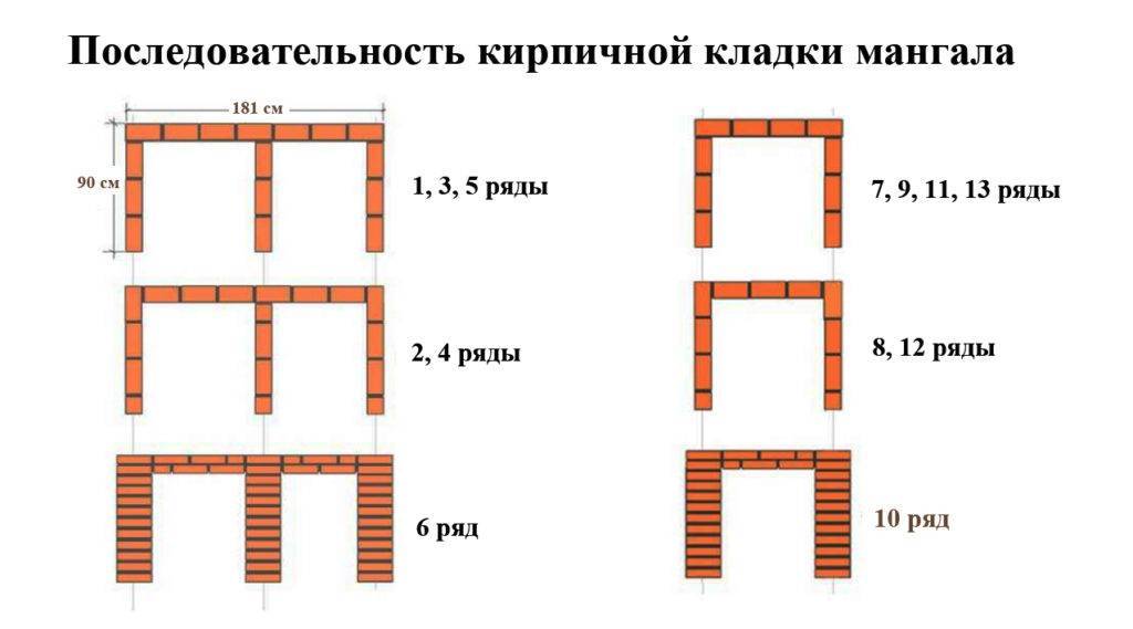 Называется подобная кладка «на постель». Поперек уложенные кирпичи – это опора под листы жаровни и сетку. Если поставить «на ложок» (узкая часть кирпича), то лист жаровни будет чуть выше. Площадку под ним можно использовать для дров.