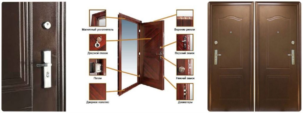 Дверные замки устанавливаются одновременно с рёбрами жесткости, в местах, укреплённых металлическими пластинами (так называемые «технологические карманы»). Между полотнами двери в качестве уплотнителя и шумоизолятора применяется негорючая базальтовая плита (альтернативные варианты: дерево, минеральная вата, стекловата, пенополиуретан, полипропилен).