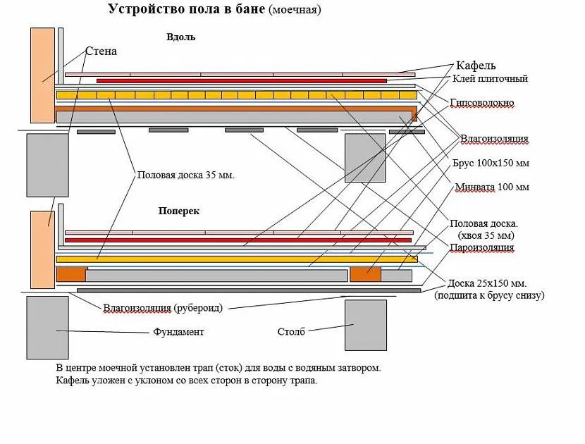 Полы в моечном помещении и парилке делаются по следующим принципам: