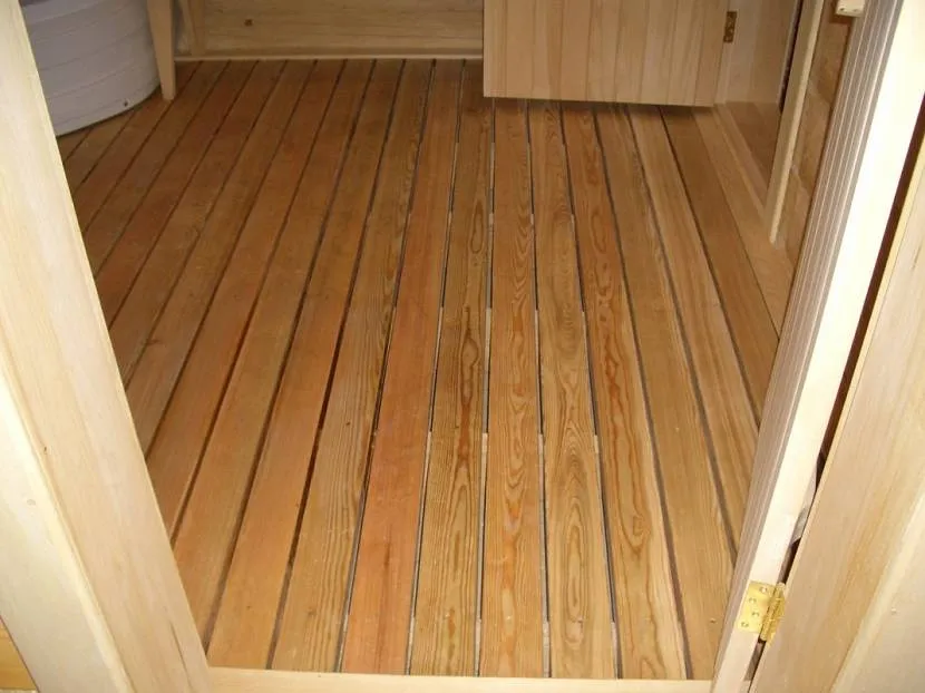 При банных процедурах вода стекает непосредственно на пол (если речь не идет о принятии душа в специально оборудованной душевой кабине). Следовательно, этот пол должен либо пропускать воду ниже, в водосборник, либо быть водонепроницаемым и устроенным с уклоном к водосборнику. Первый тип конструкции реализуется при устройстве деревянных полов с намеренно оставленными щелями или деревянной решетки.