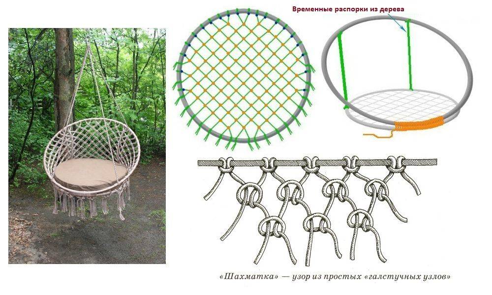 Сиденье крепят на прочные канаты. Для этого в основании делают отверстия, веревки закрепляют морскими узлами. Можно просто сделать пазы, протянуть канаты, но тогда основа будет менее устойчивой. Вместо веревок часто используют цепи. Для большей прочности их стоит закрепить гайками. Цепи не очень приятны по ощущениям, со временем они начинают ржаветь, скрипеть. У веревочных тросов тоже есть минус — они в скором времени (особенно при активном использовании) начнут перетираться. Чтобы продлить срок службы каната используют кольца.