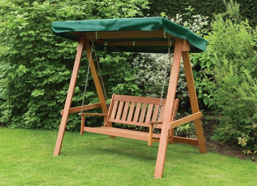 Каркасные деревянные качели красиво смотрятся в любом саду.