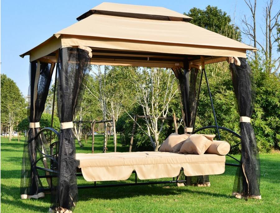 Большие садовые качели-диваны, расположенные на террасе, в саду, можно оборудовать навесом с москитной сеткой, что обеспечит комфорт отдыха, защиту от внешних природных воздействий.