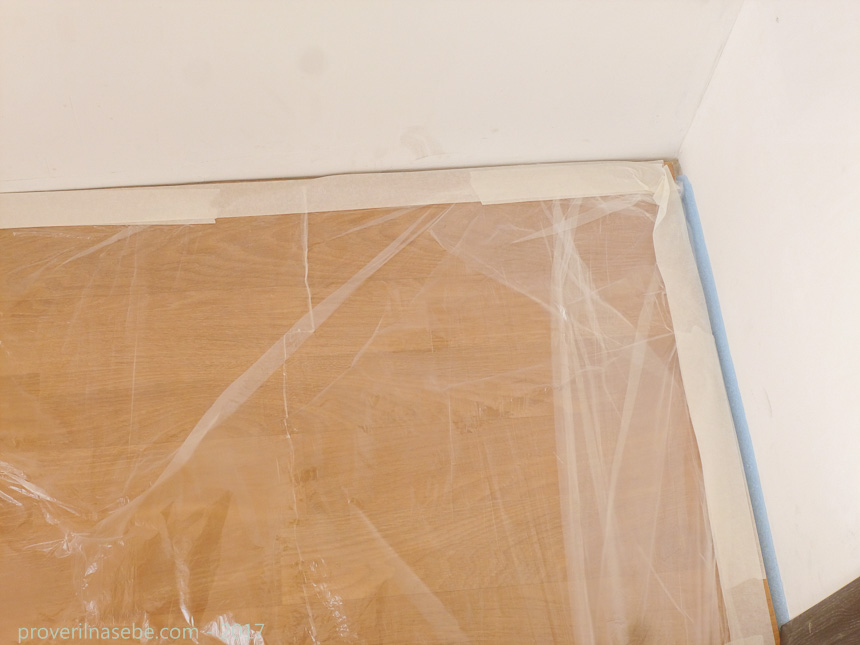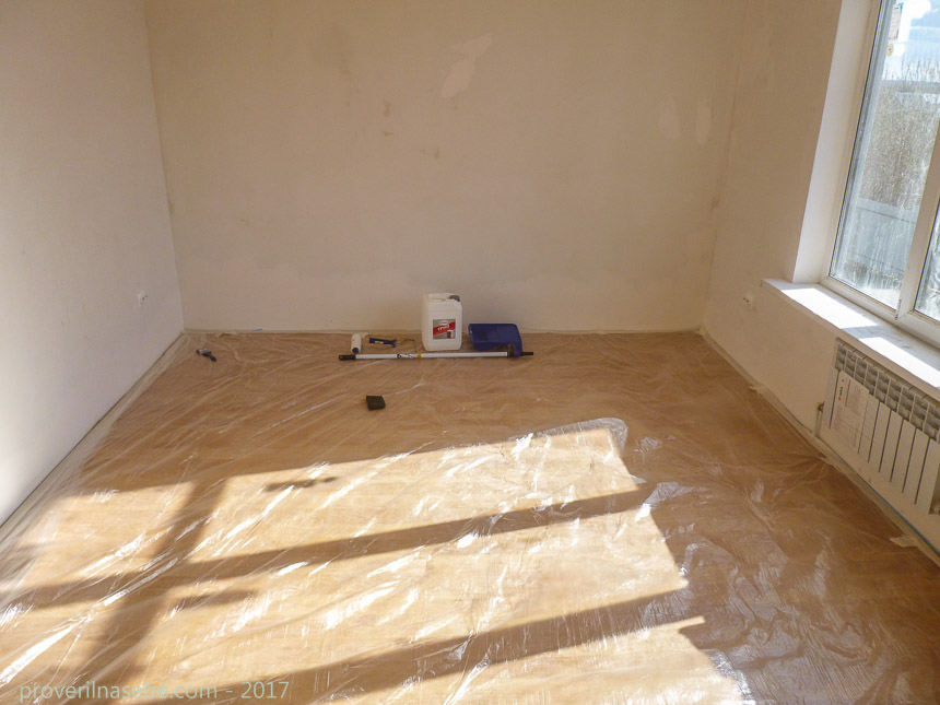 И, наконец, стоит позаботиться о защите покрытия пола, если таковое уже имеется. Вообще, лучше всего выполнять все эти жидкие работы до настила полов. Но ситуации бывают разные. У меня, к примеру, сначала на пол лег ламинат, а уж потом началась обработка стен.