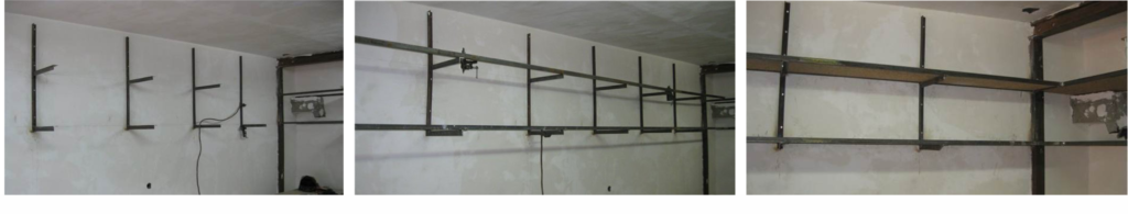 Чтобы повесить на стену двойную двухметровую полку, потребуется как минимум 6 анкеров. На них навешиваются 3 или 4 (тогда анкеров будет вертикальные стойки из металлических полосок, к которым следует приварить каркас полок, сваренный из уголка или профиля.