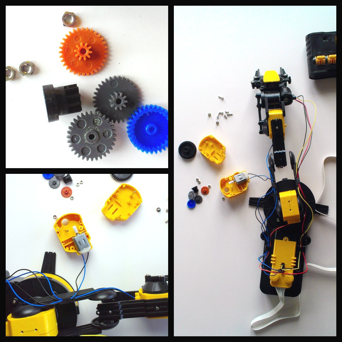 Решив попробовать подвигать рукой по максимальной амплитуде, удалось добиться характерного треска и отказа функциональности механизма мотора в локте. Сначала это меня огорчило: ну вот, новая игрушка, только собрана — и уже больше не работает.