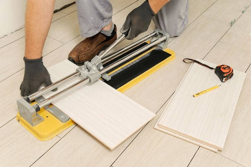 - ручной плиткорез – это самый популярный вариант, поскольку приобрести его значительно проще и дешевле, чем любой другой. Для того чтобы отрезать часть элемента, на плитке делают соответствующую разметку, после чего при помощи плиткореза и физических усилий, отрезают ненужную часть;