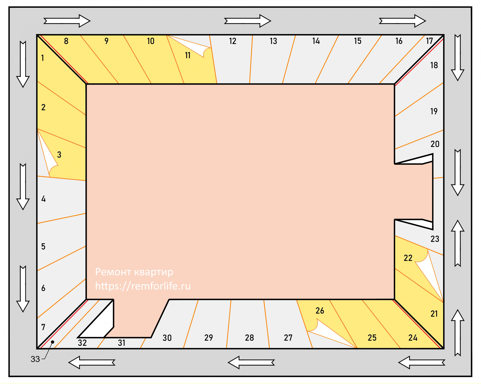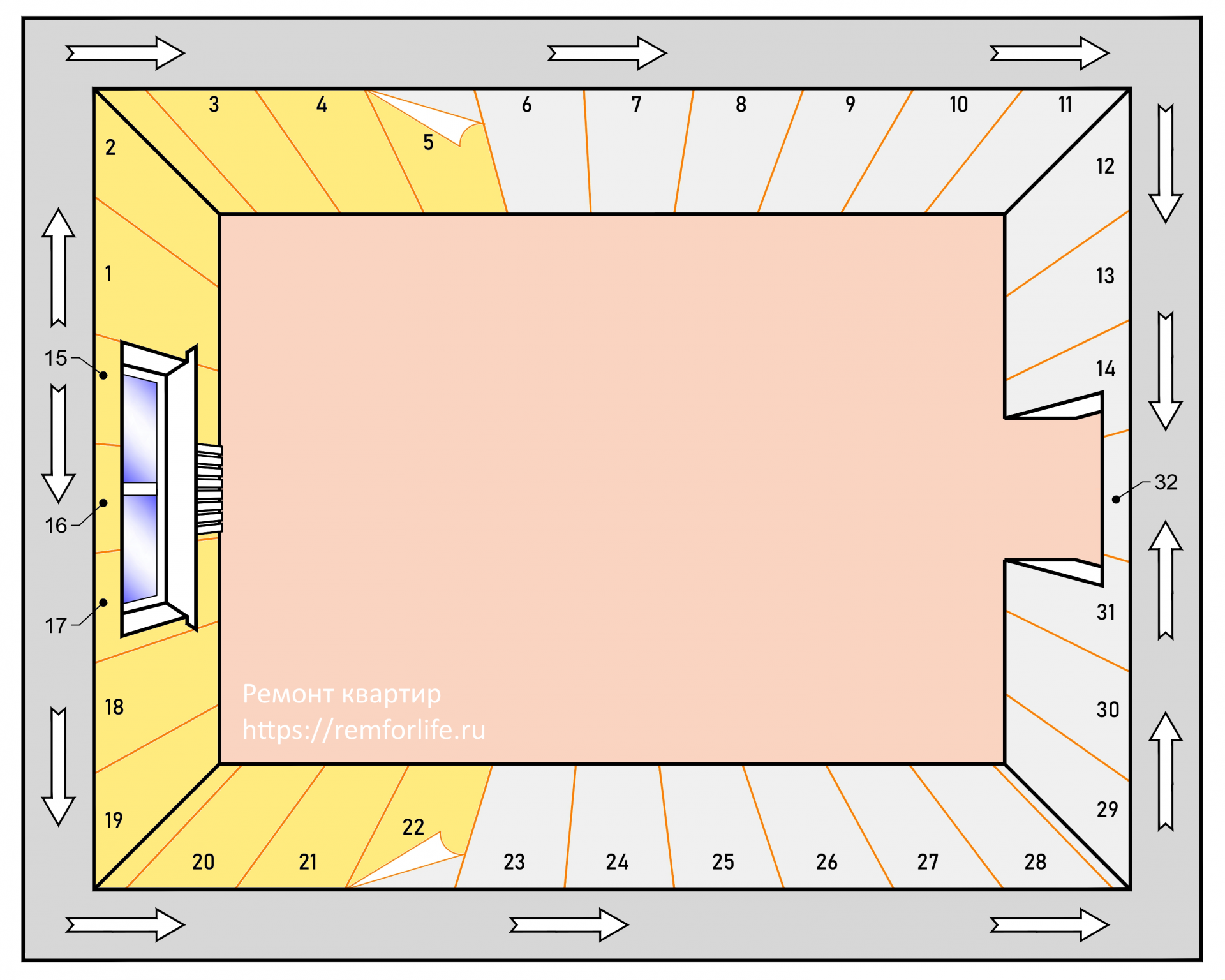 Схема поклейки обоев от окна (вариант 1, с одним окном в комнате)