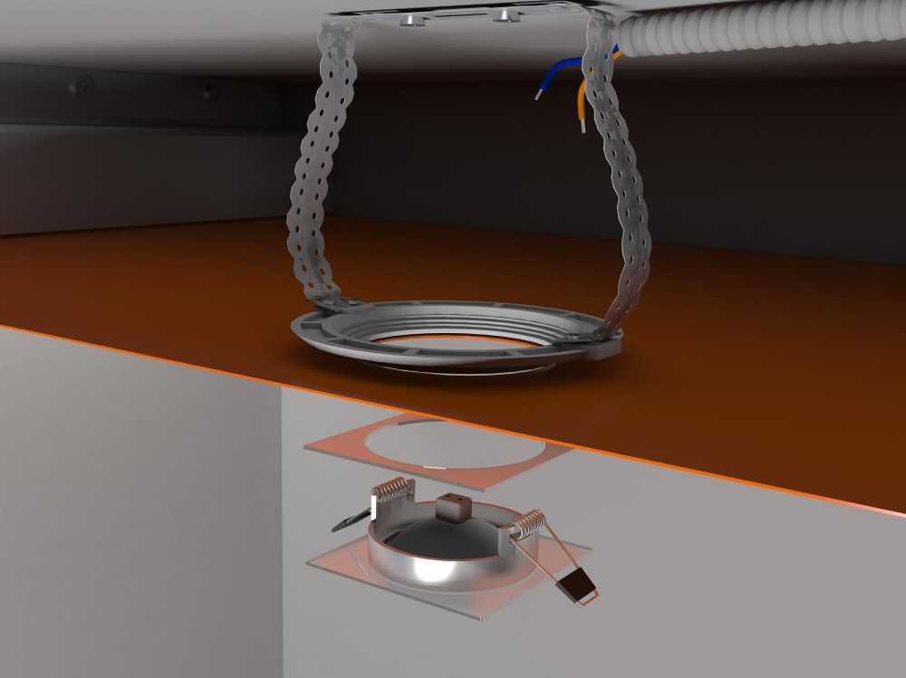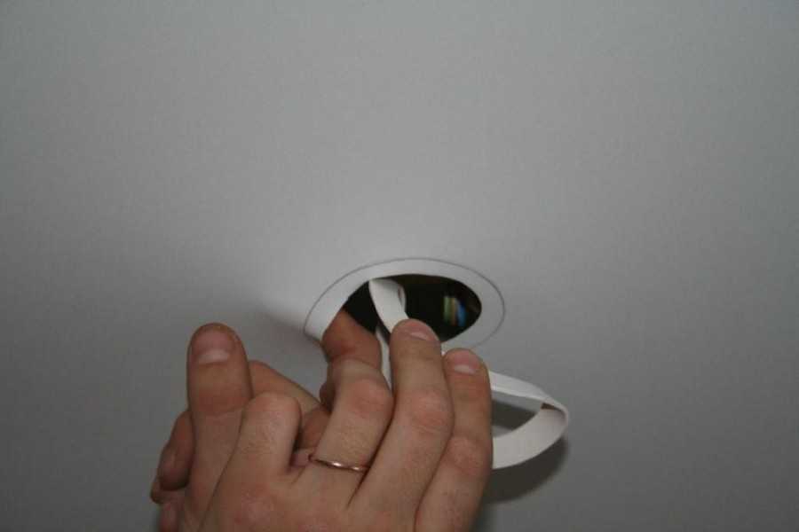 Внутри колец прорезают отверстия, через которые наружу выводят провода. Кабель подсоединяют к приборам освещения, светильники вешают обычным способом.
