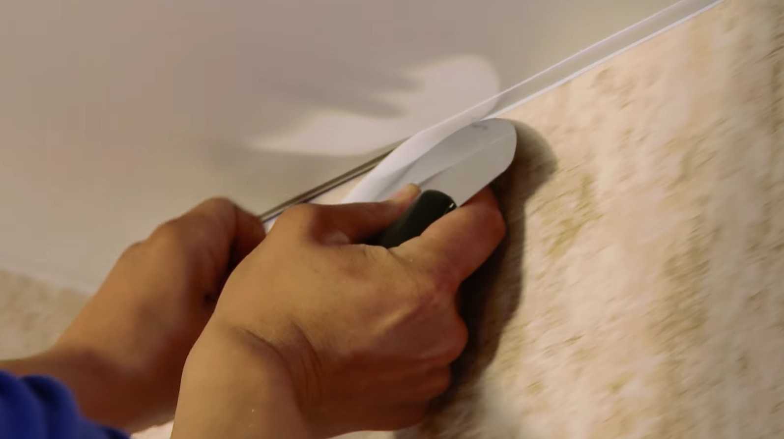 По окончании установки пленки ПВХ или тканевого полотна, по периметру крепят маскировочную ленту или декоративный плинтус, которые скроют образовавшиеся зазоры между стеной и декоративным потолком. Чтобы не появилось стяжек на полотне, изделия фиксируют к стенам. С лентой работать проще: полоса легко вставляется и вынимается из паза. При этом выбрать заглушку можно в тон полотна.