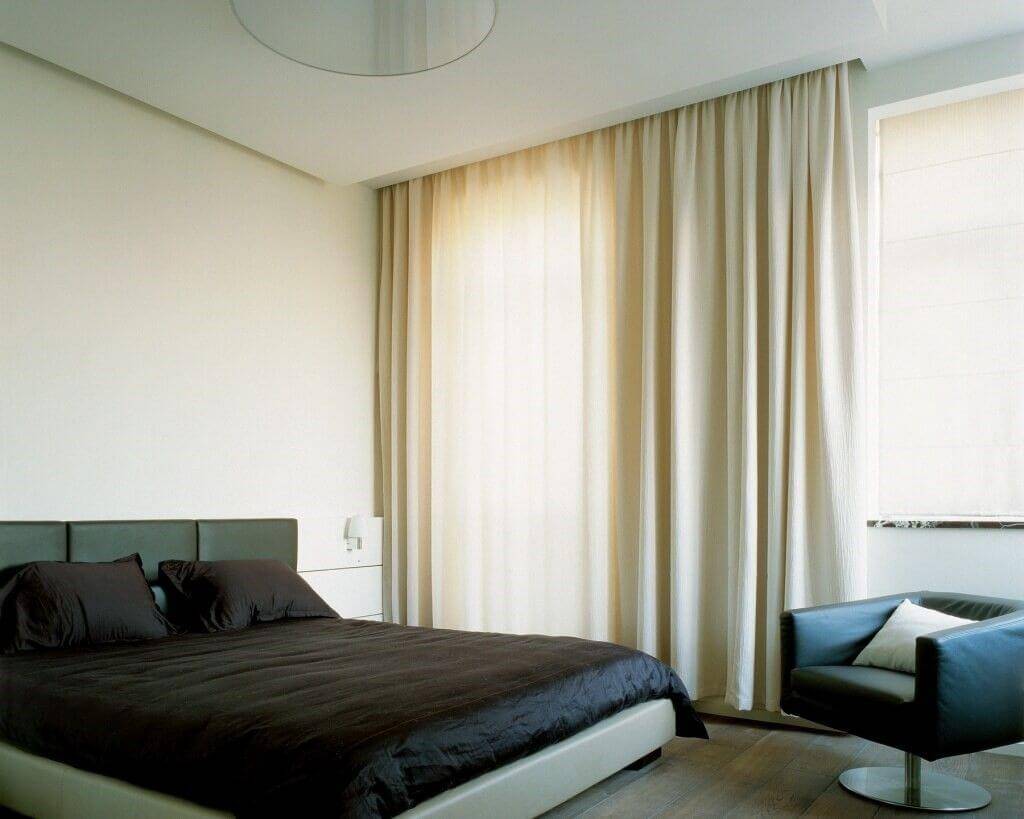 При таком монтаже, длинные струящиеся шторы визуально увеличивают высоту комнаты.