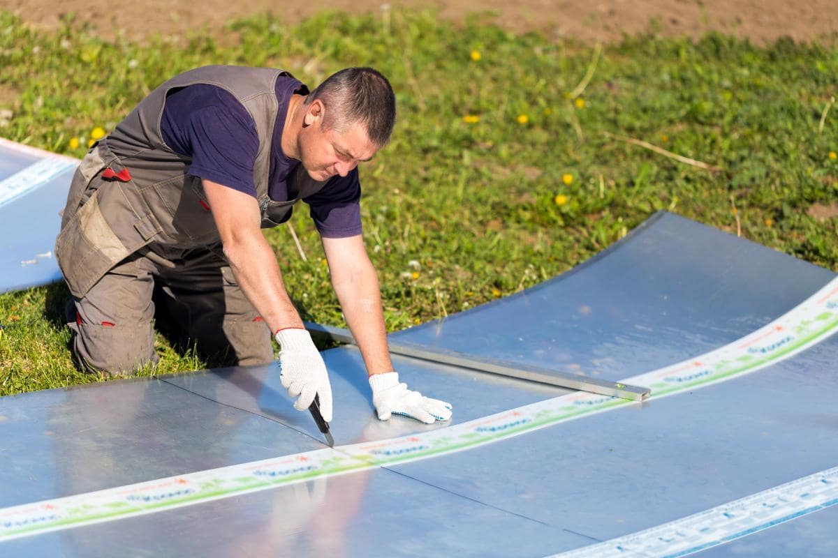 Нарезаются листы поликарбоната в размер. Можно заранее не вырезать материалам по требуемым размерам, сделать это после их установки при помощи ножа;