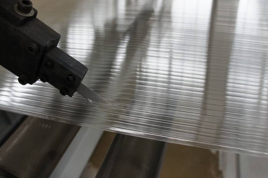 На фото- процесс резки поликарбоната