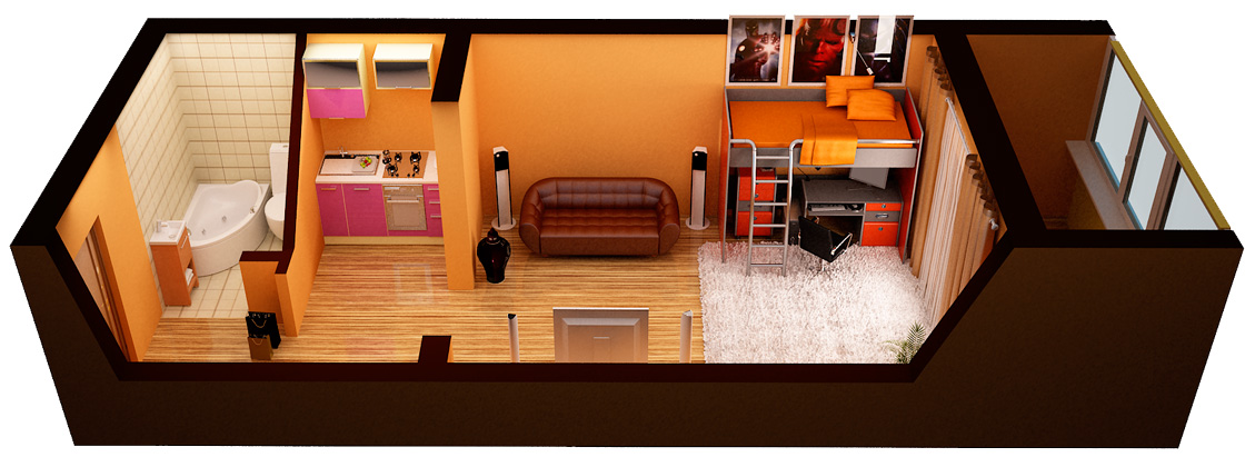 Также в студии необходимо выделить одну или несколько территорий для того чтобы хранить вещи, при всем этом можно отказаться от организации передней. Все вещи можно хранить в одном встроенном шкафу, но данный вопрос тоже необходимо решить, перед тем как браться за ремонт.