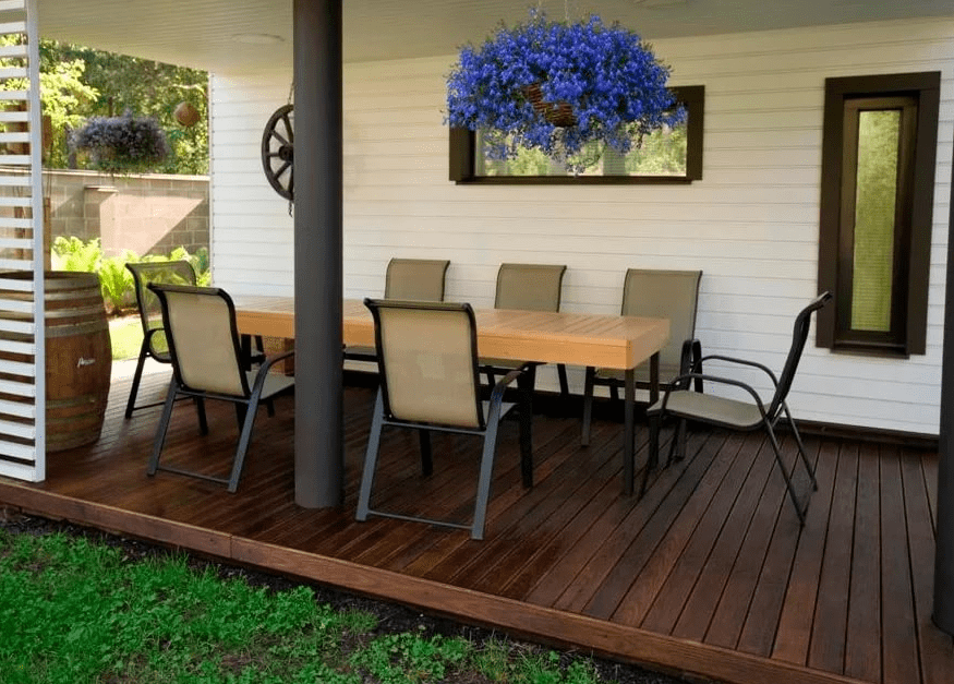 Для пола на открытой веранде требуется создание каркаса и пропускания лаг. Лаги ставятся перпендикулярно направлению каждые 400-600мм. После этого доска просто прибивается гвоздями или прикручивается шурупами. Работать с этим материалом надо очень аккуратно – удар мимо гвоздя может испортить внешний вид покрытия.