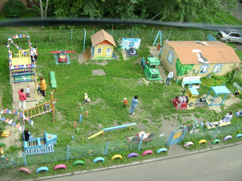 Отличный вариант оформления — детская площадка, созданная из шин, либо бутылок из пластика, дисков.