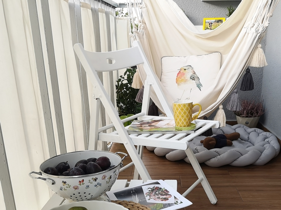 Если на вашем балконе много зеленых растений — драцены, пальмы, плющ — тогда используйте белый, льняной гамак с орнаментом в стиле бохо. Таким образом вы создадите стилизацию, которая будет напоминать гостиничный балкон из экзотической страны — так вы будете каждый день чувствовать себя в отпуске.