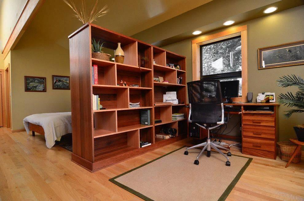Если квартира совсем маленькая и выделить под кабинет отдельную комнату невозможно, можно создать его иллюзию, оградив часть помещения визуально (при помощи арки, стеллажа, ширмы). В таком случае в рабочую зону достаточно установить небольшой письменный стол, пару книжных полок, обустроить уютное место для чтения, однако необходимо соблюдать общую стилистику помещения, тогда комната будет выглядеть гармонично.