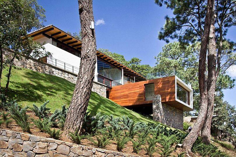 Одно из решений – выступающая из холма и опирающаяся на подпорные колонны часть дома, под которой устраивается парковка или место для отдыха. Комплекс построек в нескольких уровнях с частичным встраиванием в склон выглядит динамично, а разделение территории на зоны имеет большую выразительность.