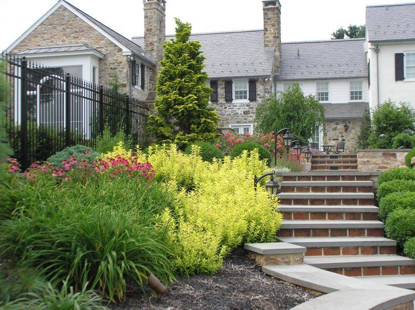 Когда дом находится в верхней части участка, все основные группы деревьев высаживаются там. Низ декорируется декоративными кустарниками, рокариями, низкорослыми деревьями.