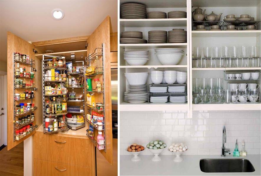 Следует уделить внимание правильной организации посуды, чтобы убрать хаос с кухонных полках и сэкономить пространство
