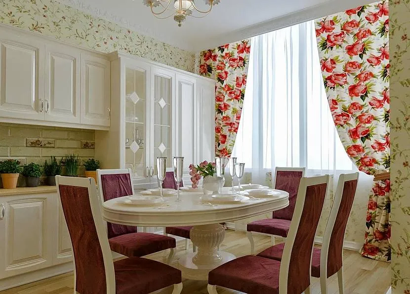Цветочные принты легких занавесок придают очарования кухне в стиле провансИсточник kuhnitut.ru