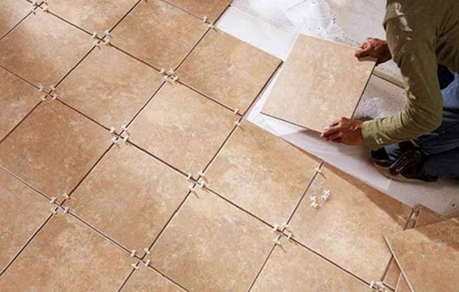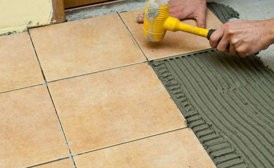 Если напольная плитка расспологается одна выше другой, нужно слегка пристукнуть ее резиновой киянкой
