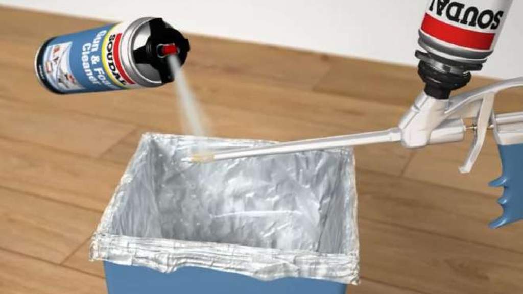 Если работа окончена, а пена ещё осталась, на пистолете нужно закрутить винт регулировки курка и снять баллон с адаптера. Его можно откручивать уверенно, на нём имеется встроенный клапан, который не позволит остаткам пены разлететься вокруг. Затем внешние поверхности пистолета промываются специальным растворителем. Баллоны растворителя пены оборудуются специальной насадкой, которую используют для распыления на промываемую поверхность.