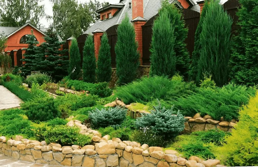 Скрыть двор получится, если вдоль забора посадить хвойные деревья. Ель легко декорировать обрезками. А еще можжевельник способен приспособиться к любым условиям и красиво выглядит во время цветения.