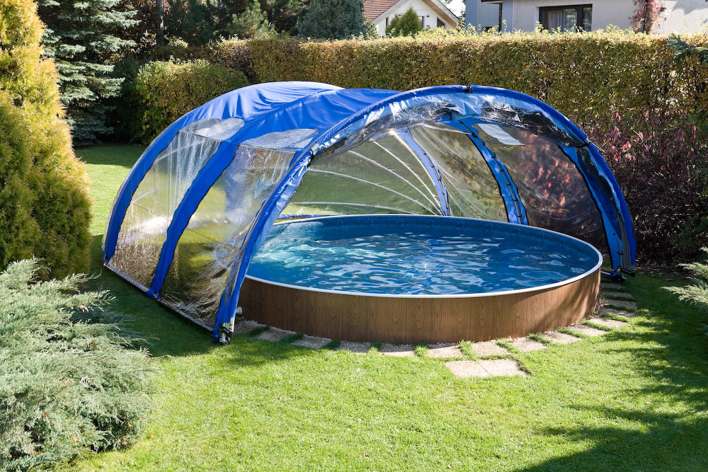 Если решено защитить сооружение от осадков, возникает вопрос, чем накрыть бассейн на даче. Для этих целей подойдут поликарбонатные плиты, закрепленные на наклонном или полукруглом каркасе, либо накрытие из пленки или ткани. В любом случае понадобится несущий каркас.