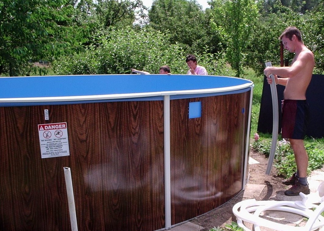 Дача, на которой устанавливается подобный бассейн, должна располагать достаточной территорией, почвой. К покупке включается инструкция, объясняющая, как собрать каркас пошагово. На подготовленной площадке наносят разметку, отображающую границы. Можно огородить ее лентой. Для подушки нужны песок, гравий, смешанные с цементом. На 10 частей песчано-гравийной смеси берут 1 часть цемента. Высота подушки – 30-40 мм. Ее посыпают слоем песка, тщательно утрамбовывают. Следующим слоем идет полистироловая прокладка, покрытая плотной пленкой.