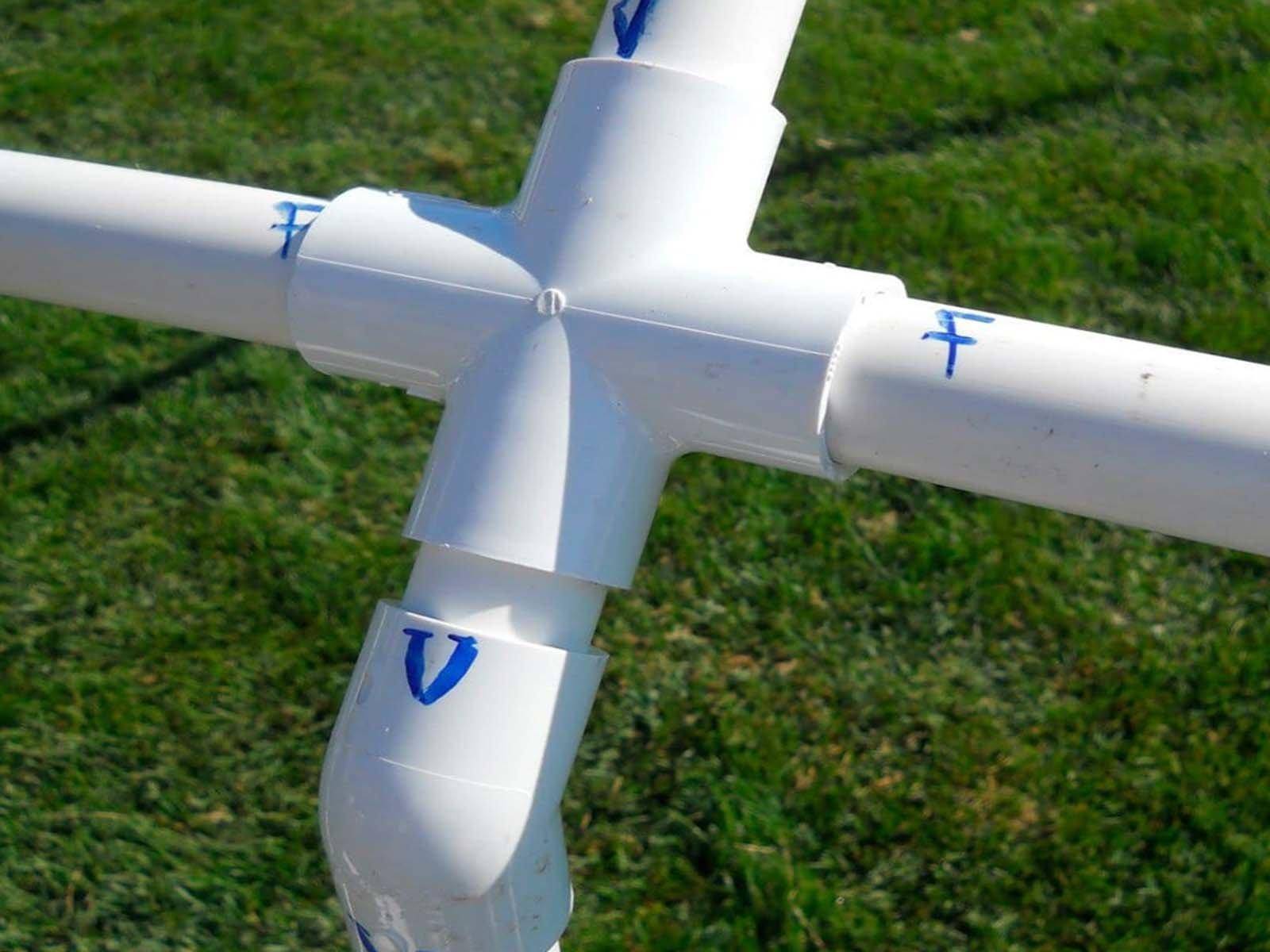ШАГ 2: собираем каркас. Для того чтобы сделать ровный каркас – необходимо нарезать нужное количество продольных и поперечных труб, и соединить их через специальные переходники (фитинги) между собой с помощью паяльника для ППР труб. После того, как весь каркас нашей самой простой беседки собран – вставляем его в трубы, которые забетонированы в земле. Обидно будет, если вы не подобрали трубы нужного диаметра и получилась небольшая несостыковочка.