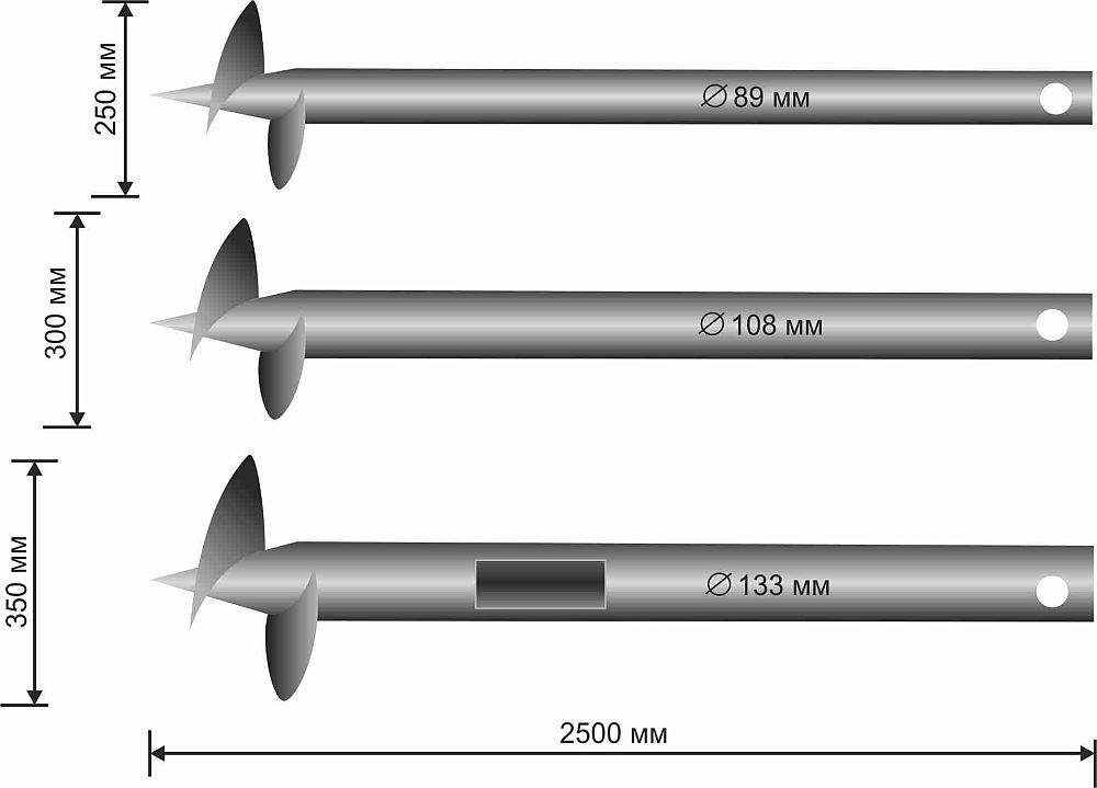 Материалом винтов являются стальные трубы с толщиной стен в среднем от 8 до 12 мм, диаметром – от 50 до 350 мм. Лопасти («резьбы») выполняются перпендикулярно к трубной оси, диаметр их от 200 до 900 мм. Они препятствуют выдавливанию свай из почвы, способствуют распределению давления на опоры от сооружения.