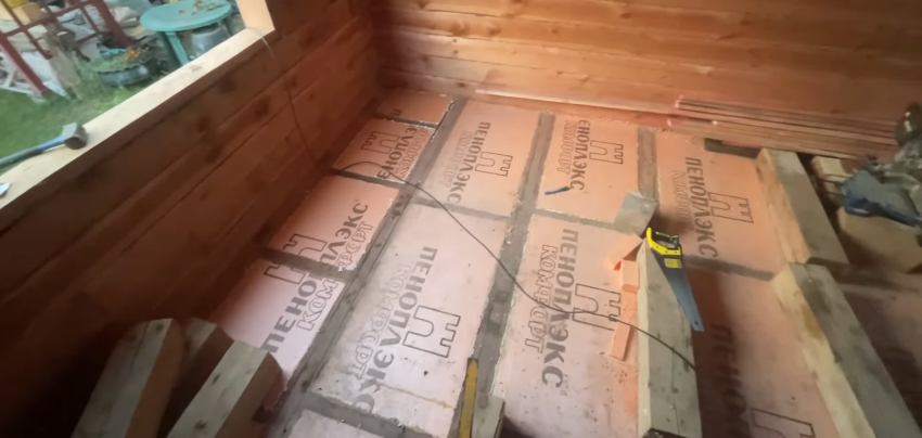 Слой утеплителя закрывают фанерными листами или доской уже для чистового пола