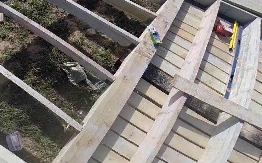 После проверки собранной конструкции на соответствие горизонтальному уровню снизу набивается обрешетка. Далее на нее будет установлена подоснова.