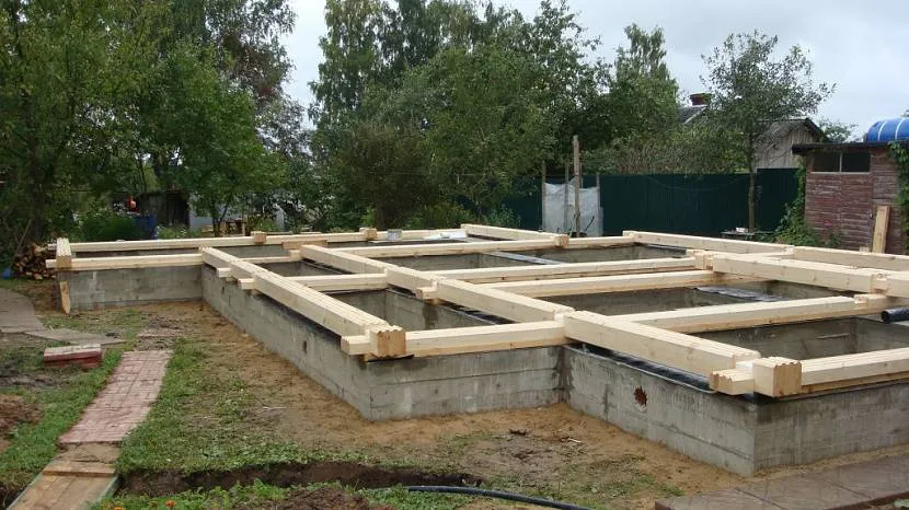 По периметру установленного фундамента монтируются лежни, которые крепятся к фундаменту специальными анкерами. Перед закреплением лежней надо проверить все размеры и соответствия диагоналей. Дальше на торец ставится обвязочная доска к которой крепятся лаги из досок поставленных на ребро.