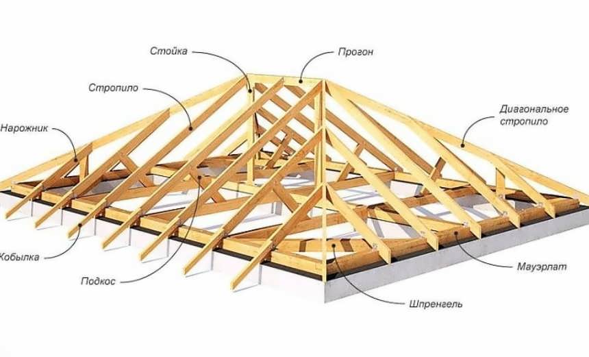 мауэрлат, лежень – мощная обвязочная балка, монтируемая на верхнюю плоскость стен по периметру здания и внутренних перегородок; кровельные скаты формируются за счет наклонных балок, устанавливаемых с расчетным интервалом, — стропильных ног; вместе с элементами жесткости – затяжками, стойками и раскосами – стропила образуют кровельные фермы; коньковый прогон – брус, соединяющий верхние точки ферм; в некоторых конструкциях нижняя часть стропильных ног удлиняется за счет дополнительной детали — кобылки.
