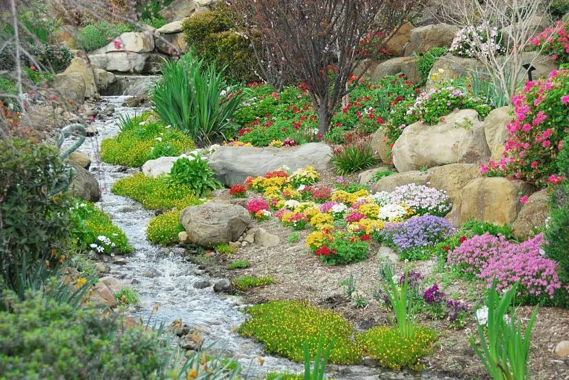 Сухой ручей сочетается с альпинарием или рокарием — эти виды декоративных цветников эффектно дополняют друг друга